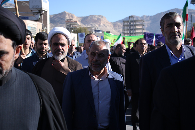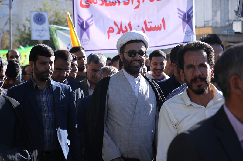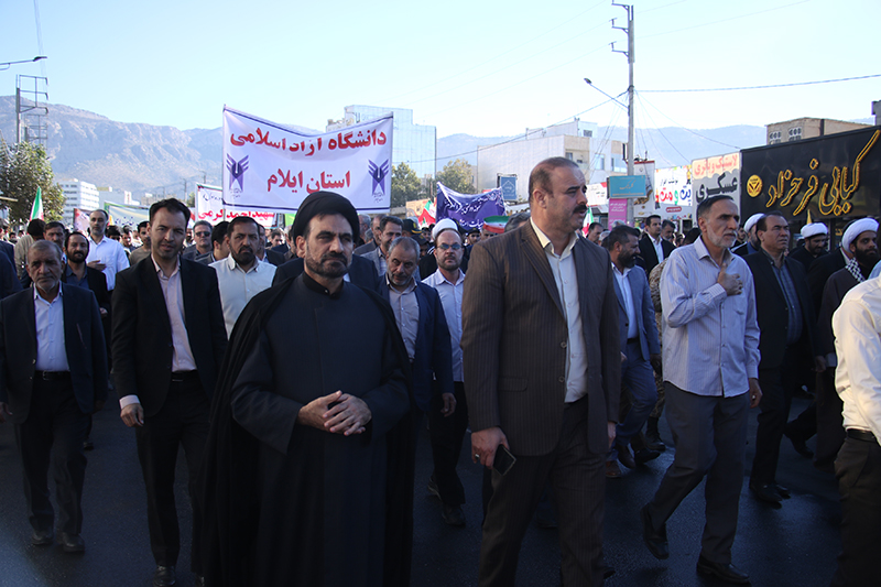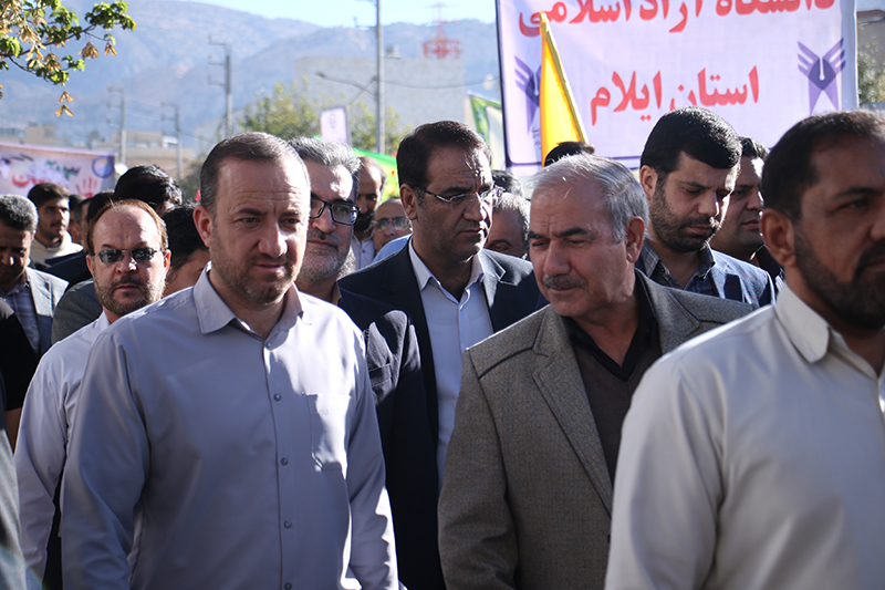 همزمان با ساير اقشار مردم شهر ايلام، حجتالاسلام والمسلمين دکتر حسينينيا مسئول دفاتر نهاد نمايندگي مقام معظم رهبري در دانشگاههاي استان ايلام، حجتالاسلام والمسلمين هاديزاده مسئول دفتر نهاد نمايندگي مقام معظم رهبري در دانشگاه ايلام، دکتر طاهريمقدم معاون فرهنگي و اجتماعي و جمعي از اساتيد، کارکنان و دانشجويان دانشگاه ايلام، در راهپيمايي 13 آبان، روز ملي مبارزه با استکبار جهاني شرکت کردند و با آرمانهاي انقلاب اسلامي تجديد ميثاق نمودند.