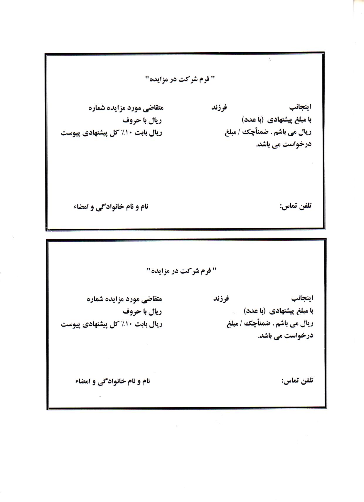 متقاضيان محترم ميتوانند تا پايان وقت اداري روز شنبه 94/06/28 درخواست کتبي خود را همراه با مبلغ پيشنهادي به دبيرخانه مرکزي واقع در ساختمان سازمان مرکزي تحويل نمايند.