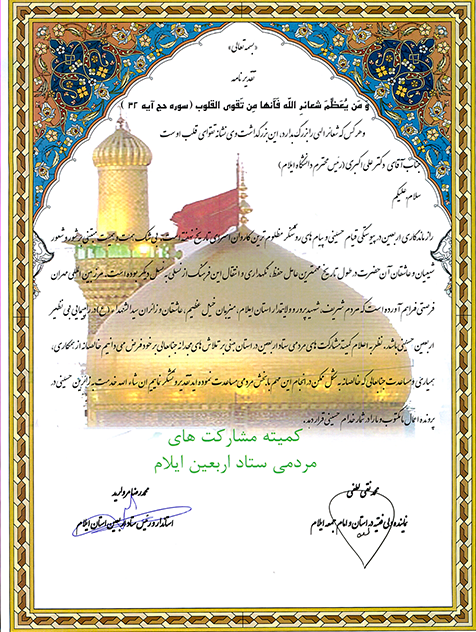 به گزارش روابط عمومي، در راستاي مشارکت هاي مردمي ستاد اربعين و همکاري و همياري رييس دانشگاه ايلام و مجموعه دانشگاهي در استقبال از زائراين سيدالشهداء عليه السلام، از طرف نماينده محترم ولي فقيه در استان و استاندار محترم و رئيس ستاد اربعين استان ايلام از دکتر محمد علياکبري رييس دانشگاه تقدير شد.