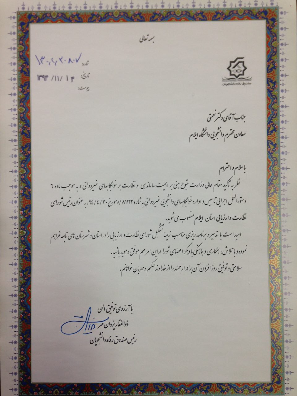 معرفي رئيس شوراي نظارت و ارزيابي خوابگاه هاي دانشجويي استان ايلام