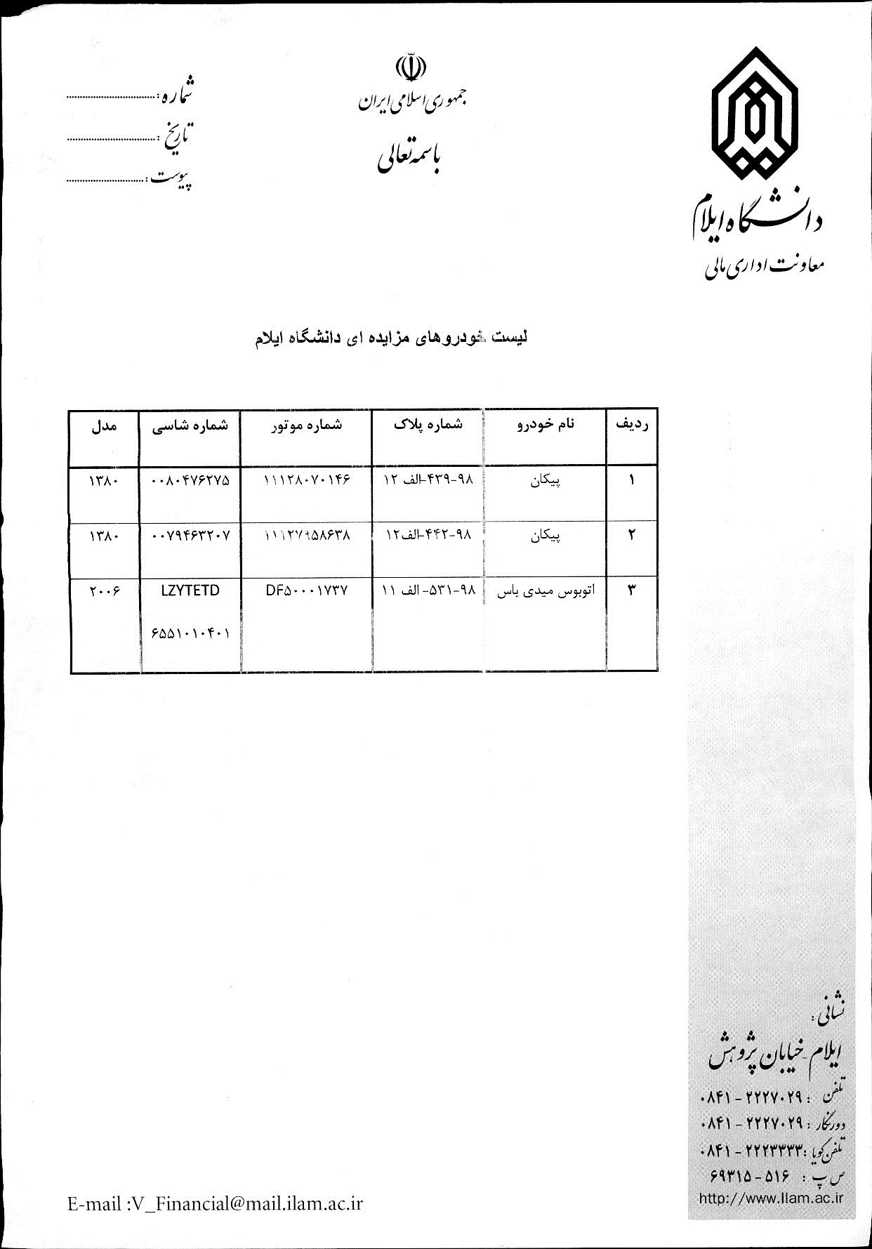 دانشگاه ايلام در نظر دارد براساس مجوز شماره 124/557 تاريخ 8/2/ 95سازمان امور اقتصادي ودارايي استان ايلام تعداد سه دستگاه خودرو مازاد بر نياز خود را به شرح ذيل از طريق مزايده عمومي به فروش برساند.