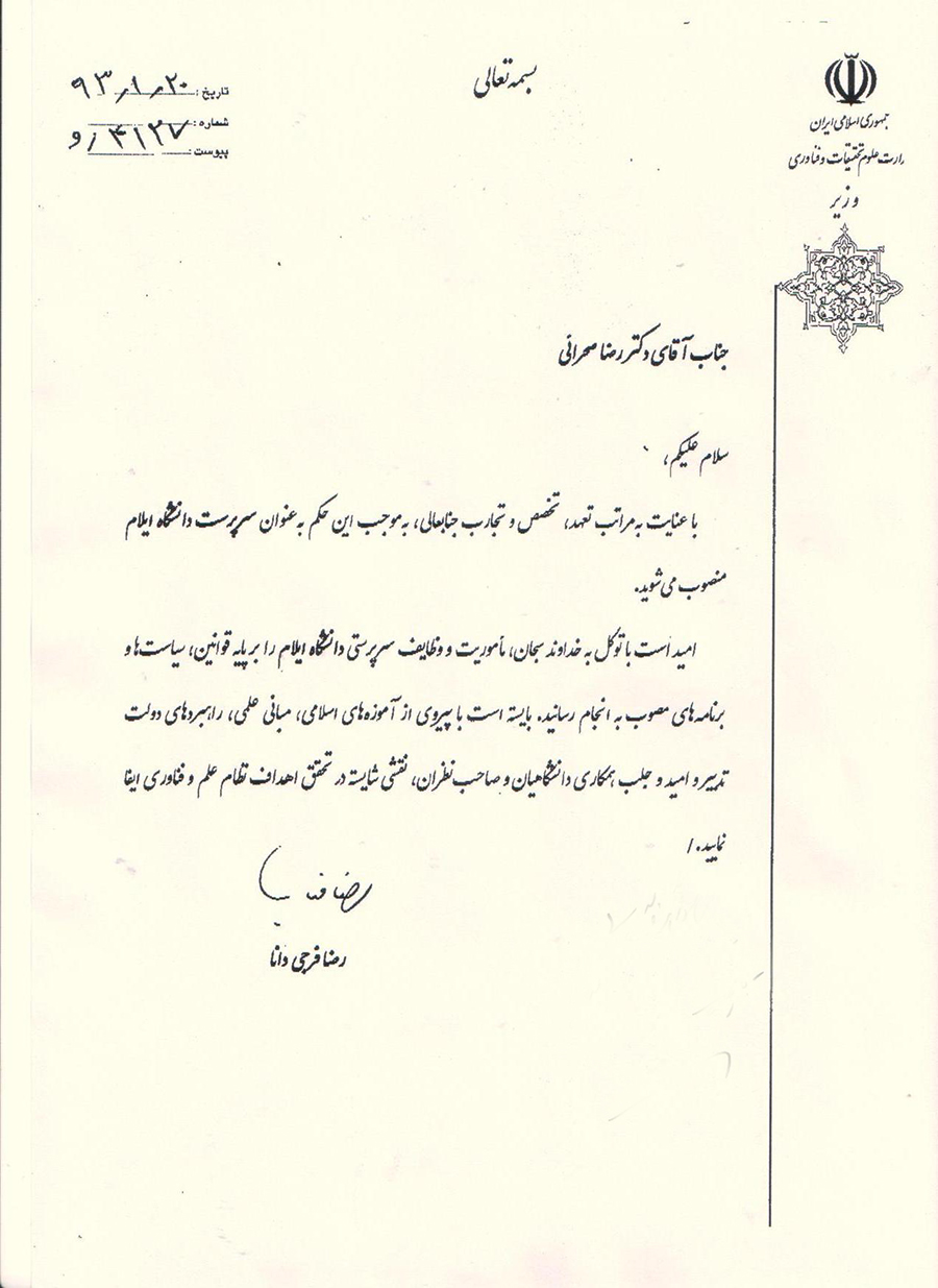 مشاهده بیشترمتن ابلاغ سرپرستي دانشگاه ايلام به دکتر صحرايي و تقدير از دکتر علي محمدي از طرف وزير علوم تحقيقات و فناوري